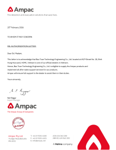 Ngày 25/02/2026, Ampac Pty Ltd – thương hiệu hàng đầu trong lĩnh vực giải pháp Hệ thống báo cháy và âm thanh di tản – đã chính thức cập nhật phát hành Thư Ủy Quyền (Authorization Letter) cho Công ty TNHH Kỹ Thuật Công Nghệ Bảo Toàn (Bao Toan Technology Engineering Co., Ltd), xác nhận doanh nghiệp này là đại lý chính thức của Ampac tại Việt Nam.